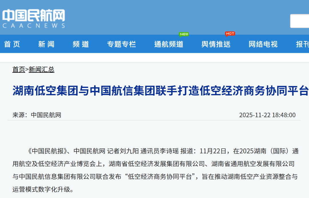 【党群工作部 图/文报道】11月22日,在2025湖南(国际)通用航空及低空经济产业博览会上,中国民航信息集团有限公司(简称“中国航信”)与湖南省低空经济发展集团有限公司(简称“湖南低空”)联合发布“低空经济商务协同平台”。中国航信党委常委李劲松出席了平台发布仪式。 对此,《中国民航报》进行了特别报道。